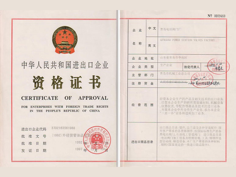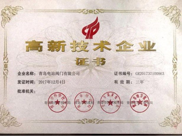電站閥門擁有國家市場監管總局的特種設備制造A1、B級認證許可,通過ISO9001質量管理體系認證,CE產品認證,環境和職業衛生管理體系認證,是國家高新技術企業,擁有青島市市級技術中心。